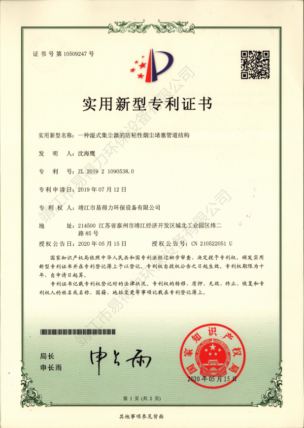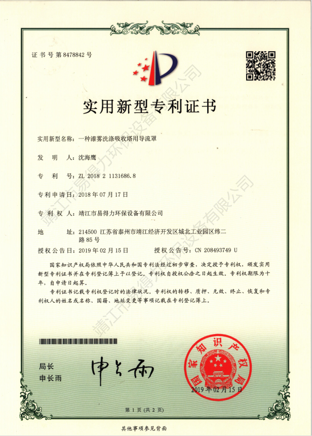 專利證書本公司坐落于開放開發(fā)超前城市江蘇靖江,我們精良優(yōu)秀設(shè)計(jì)團(tuán)隊(duì)始終遵循著創(chuàng)新超越的理念,贏得了中外合資企業(yè)的信賴。易得力環(huán)保設(shè)備有限公司與上海環(huán)科院等科研單位保持合作關(guān)系,不斷加大自身的科研力量,集中了一批國內(nèi)環(huán)境科技研究和應(yīng)用方面的高素質(zhì)人才,取得多項(xiàng)實(shí)用新型專利證書。…… 查看更多 >>